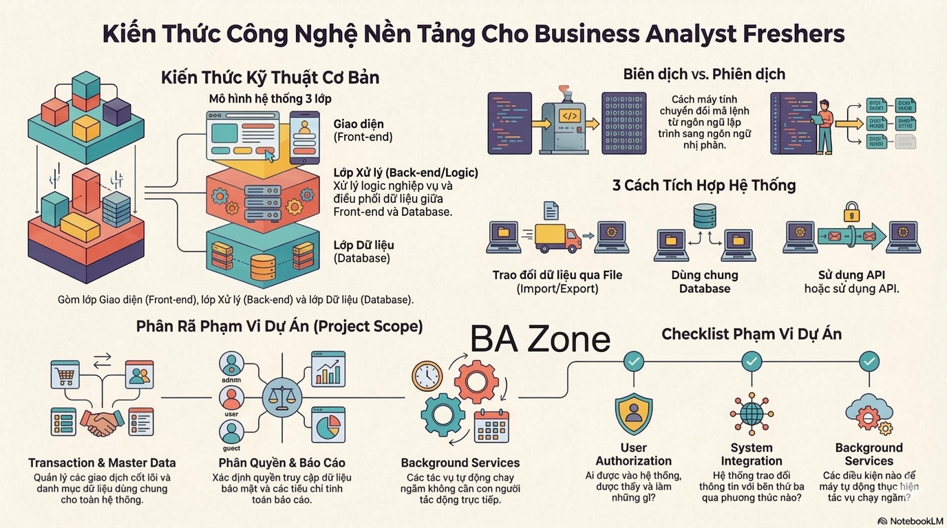 Rất nhiều bạn Fresher khi mới vào dự án thường bị “ngợp” vì không hiểu Dev nói gì, dẫn đến việc đưa ra các yêu cầu “trên trời” hoặc thiếu tính thực tế. Để giúp anh em BA Zone tự tin hơn khi “đối mặt” với đội kỹ thuật, mình đã tổng hợp 4 trụ cột công nghệ nền tảng nhất: