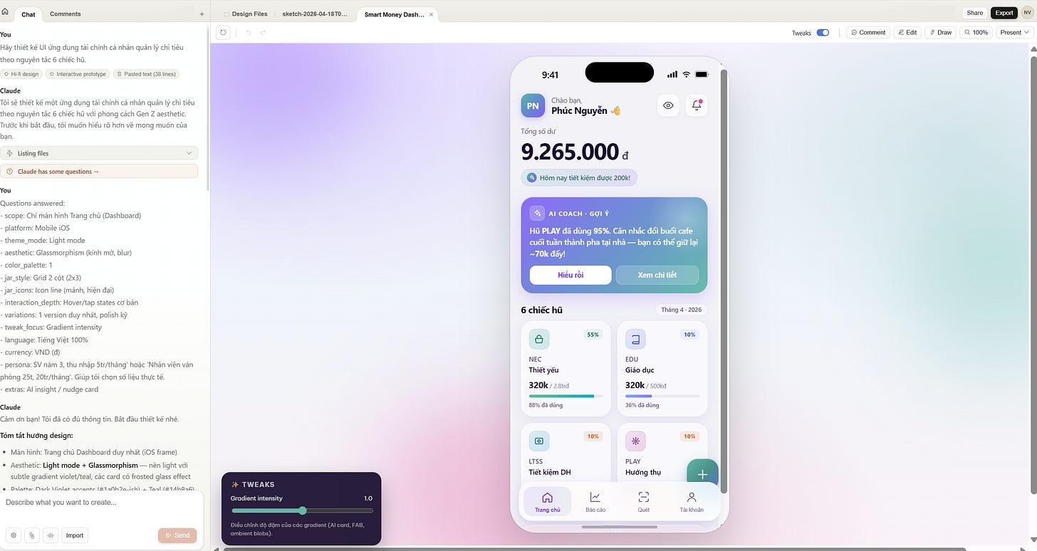 Thay vì phải kéo thả trong Figma, bạn chỉ cần nói: "Thiết kế cái app tài chính cá nhân theo nguyên tắc sáu chiếc hũ".